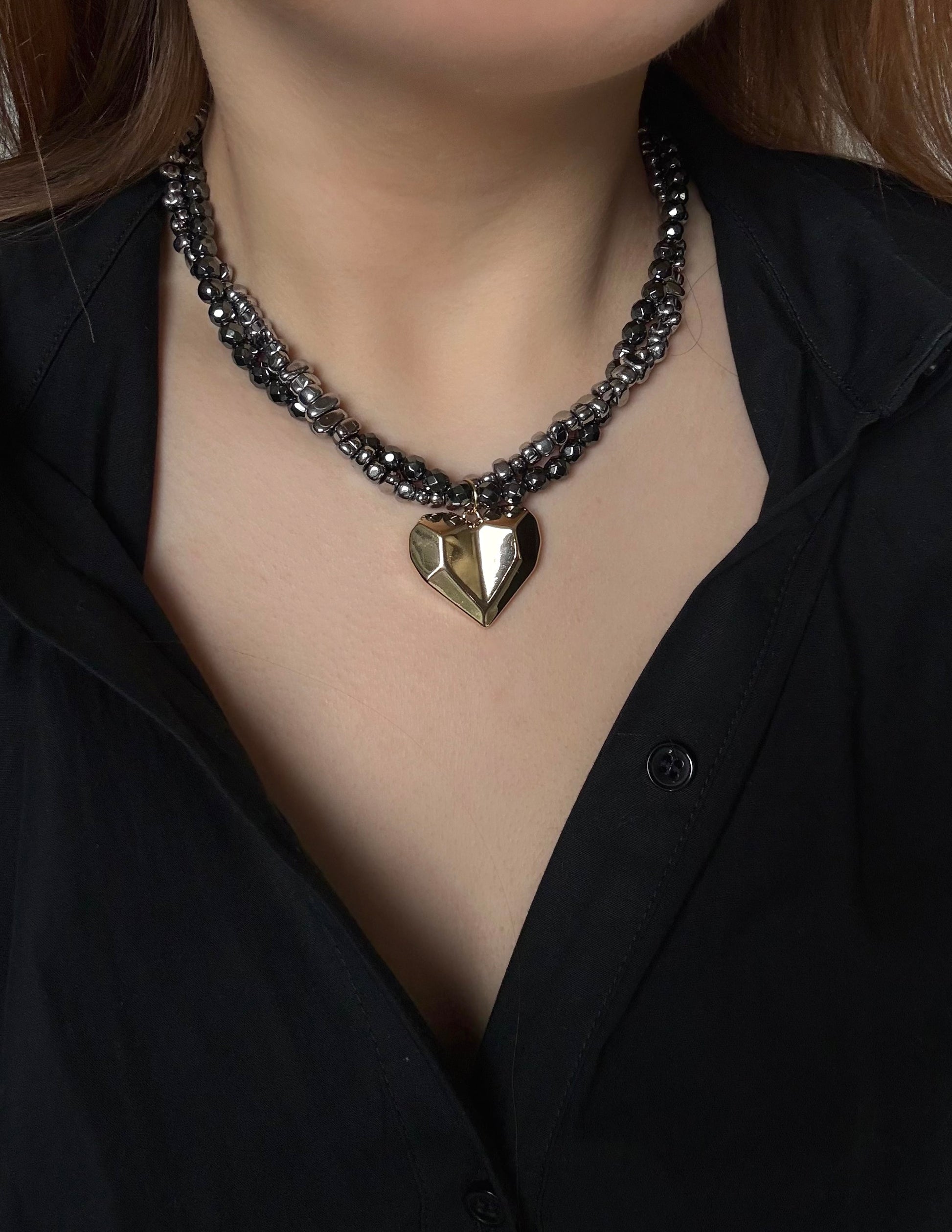 Elevate your style with this striking twisted hematite heart necklace. Embrace elegance and individuality with every wear.